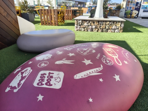 アートコラボレーションは、成田空港圏で活躍中のアーティスト・シムラユウスケさん。シムラさんらしい配色の、カラフルな空間になっています。