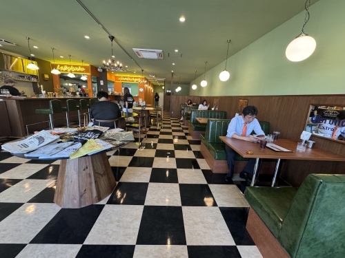The spacious interior harmoniously blends wood grain accents with American vintage style, featuring sofa seating, counter seating, and even terrace seating. This makes it perfect for families and groups of friends, and you can relax here comfortably even when dining alone.